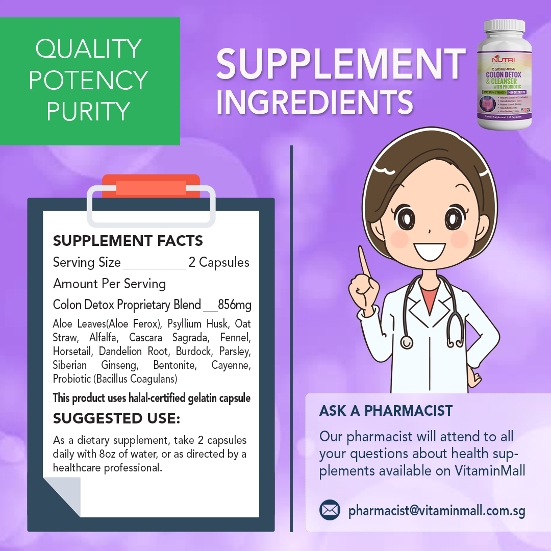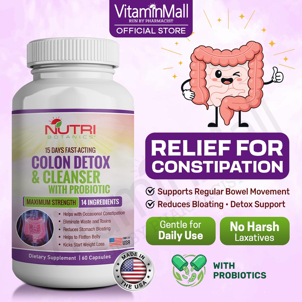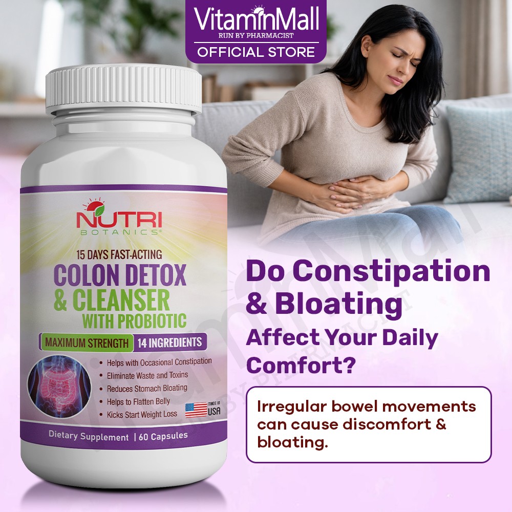 Constipation is a common digestive problem that can lead to serious health problems which include abdominal discomfort. Having regular bowel movements is essential to maintaining good health. Nutri Botanics Colon Detox & Cleanser with Probiotics is a health supplement which can also aids in promoting healthy weight loss. This detox supplement also contains probiotics which are good bacteria that live naturally in the digestive tract. Probiotics plays a key role in maintaining digestive and gut health, reduces bloating, and relieves constipation, making it beneficial for your health.