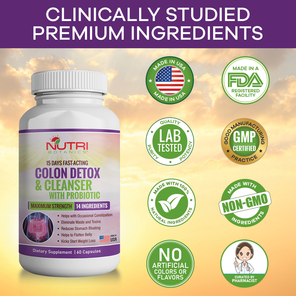 Nutri Botanics Colon Detox & Cleanser with Probiotics for Weight Loss – 15 Days Fast Acting Colon Cleanse – Natural Laxatives for Constipation Relief, Reduce Bloating, Eliminate Waste and Toxins – 60 Detox Capsules