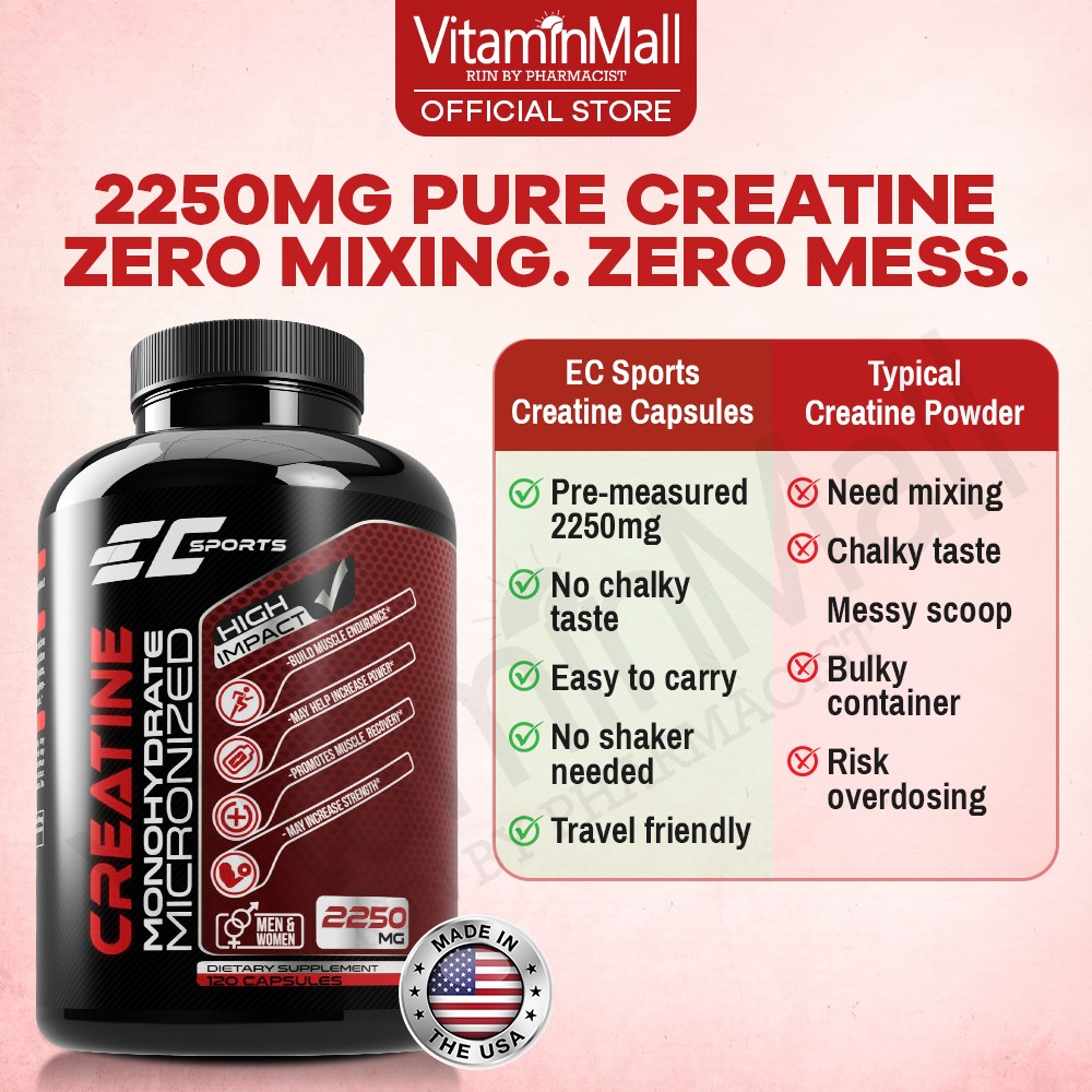 EC Sports Creatine Monohydrate 2250mg - 120 Capsules – Bodybuilding Supplements, Build Muscle, Increase Strength, Enhance Energy – Micronized Creatine