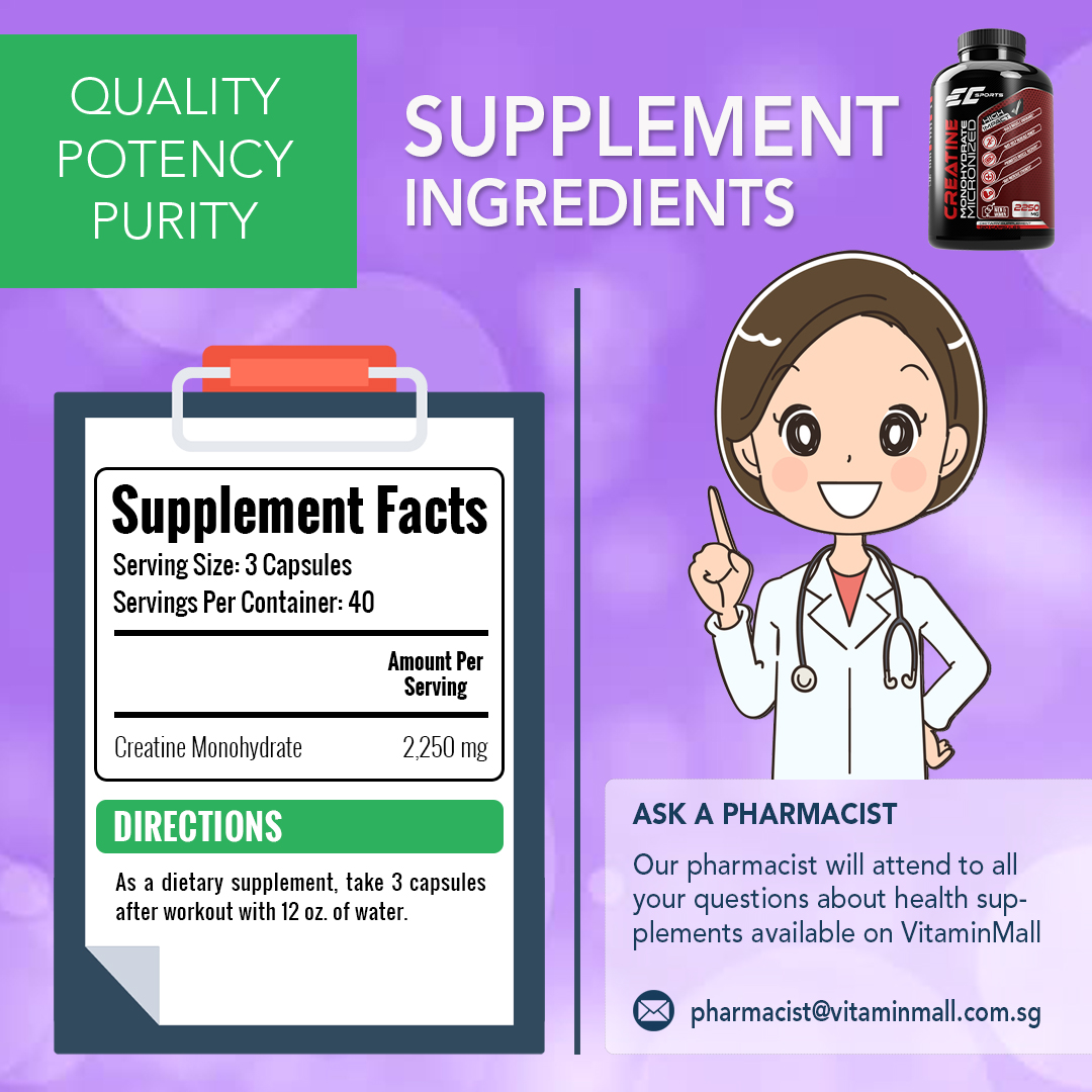 EC Sports Creatine Monohydrate come in convenient, easy to swallow capsule containing 2250mg of exceptionally pure creatine monohydrate per serving. Taking these creatine capsules is quick and easy without the need to mix a powder into a liquid. Creatine monohydrate is the most well researched form of creatine and this popular sport nutrition supplement has been shown to support muscle strength, power and size when combined with high intensity exercises.