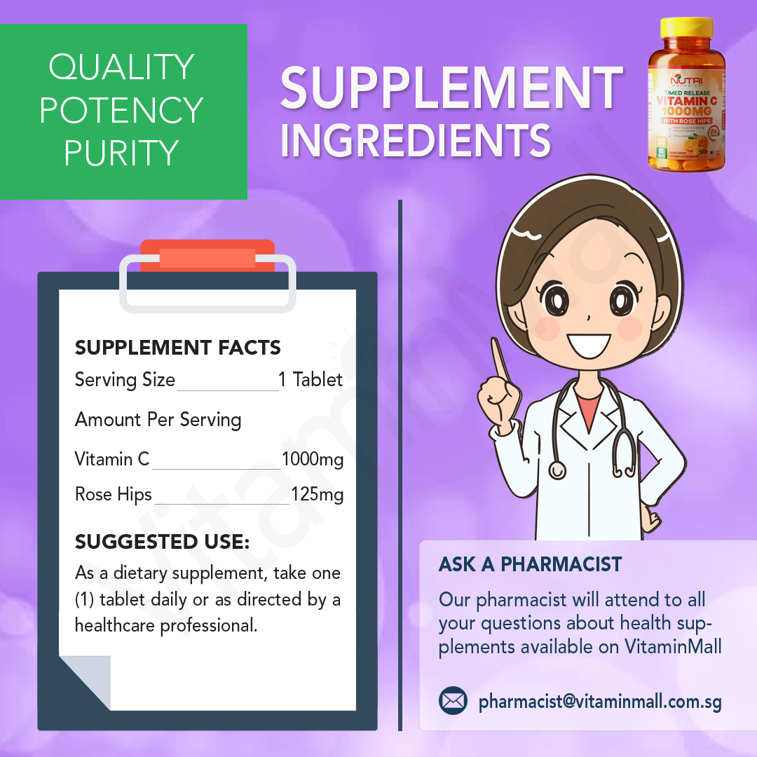 Nutri Botanics Vitamin C 1000mg Timed Release Tablet with Rose Hips is specially formulated in time release coated tablets that provide a gradual release of Vitamin C allowing you to obtain the nutrition benefits of Vitamin C over an extended period of time. Timed release vitamin C is gentler on the stomach and helps maintain optimal levels of Vitamin C in the body throughout the day.