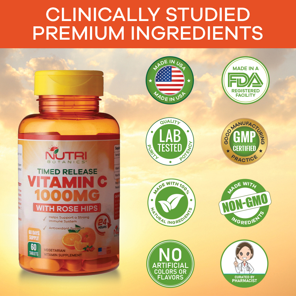 Nutri Botanics Vitamin C 1000mg Time Release Tablet with Rose Hip – Support Immune Health, Antioxidant - 60 Vegetarian Tablets – Gentle on Stomach