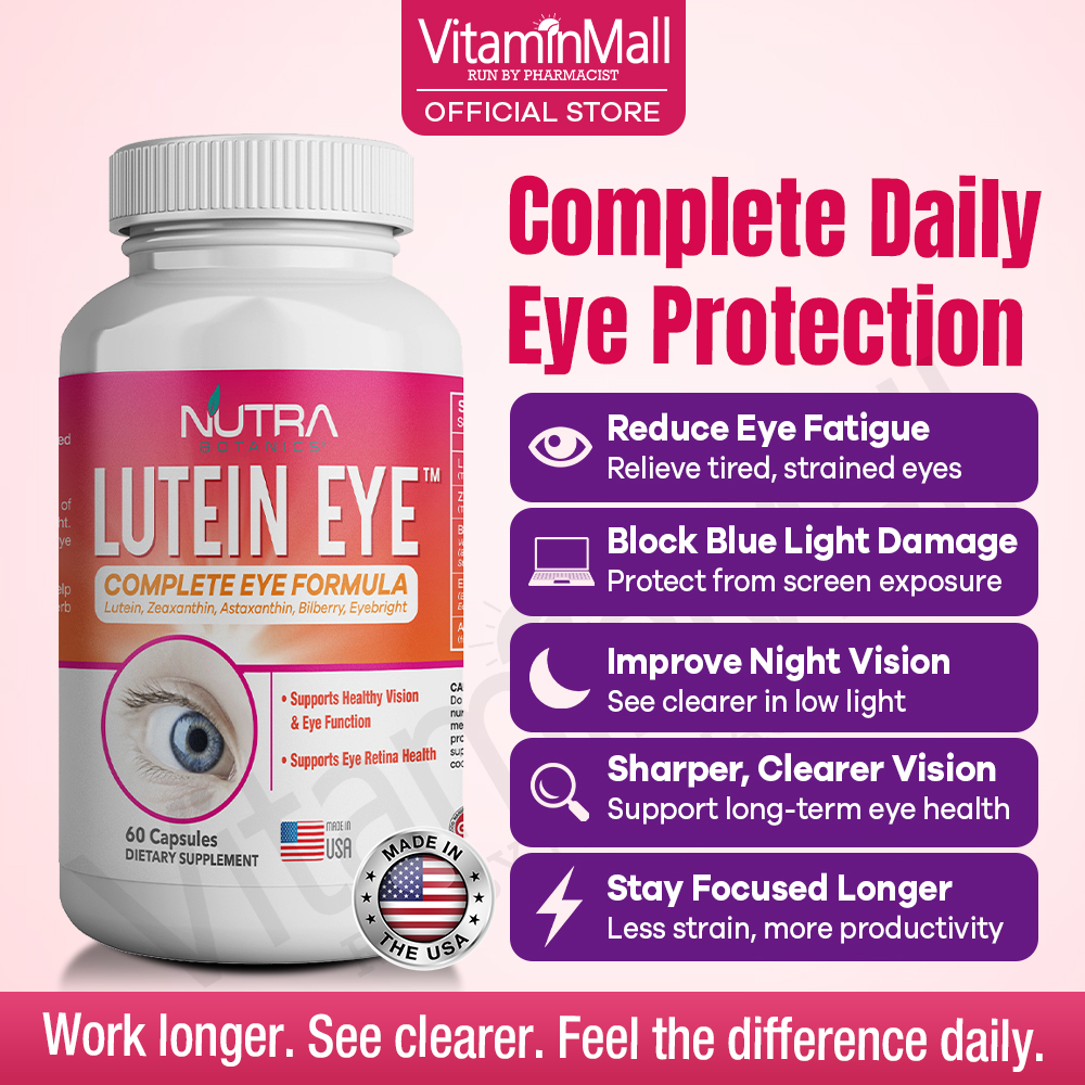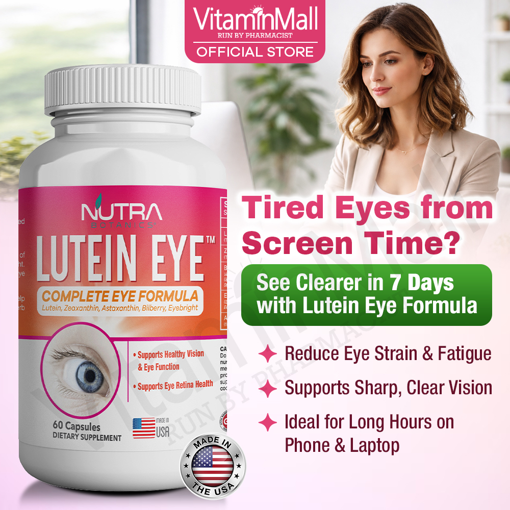 Formulated with the optimum concentration to support and maintain healthy vision naturally, Nutra Botanics® Lutein Eye can increase protection for your eyes against oxidative stress and reduce inflammation. Clinical studies have shown that Lutein has beneficial properties for eye vision health and performance, sleep quality, reduction of eye strains and fatigue from long blue-light emitting digital screen exposure. Hence, Nutra Botanics® Lutein Eye is the ideal eye supplement for people who spent hours in front of your computer daily since provides eye vitamins that can help protect your eyes and maintain healthy vision.