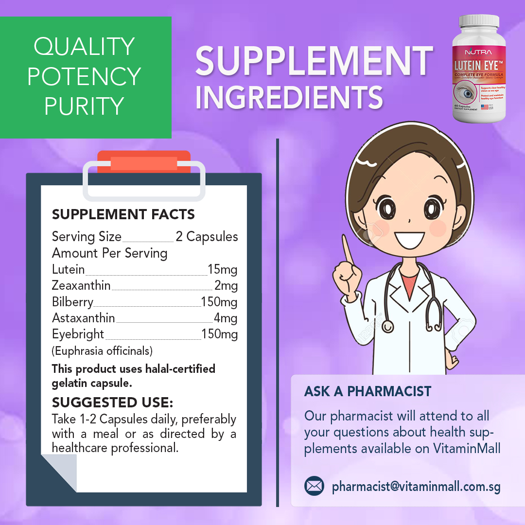 Lutein supplements are the best eye supplements since it contains powerful eye vitamins that helps to support vision and retina eye health as you age. As a powerful antioxidant that cannot be produced naturally by our bodies, lutein can only be obtain through consuming health supplements. Lutein proactively addresses the concern of developing age-related eye health issues.