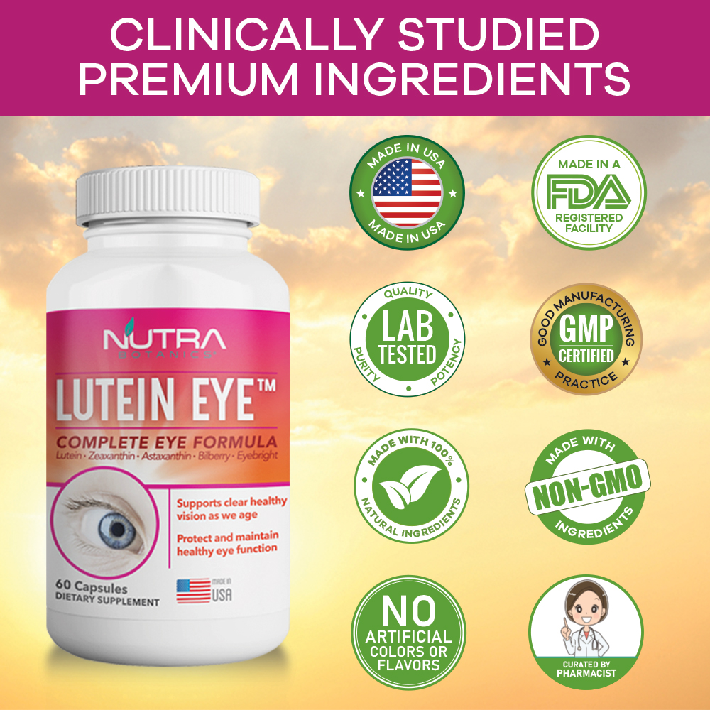 Nutra Botanics Lutein Eye - 60 Capsules - Eye Supplement with Lutein, Zeaxanthin, Astaxanthin, Bilberry, Eyebright - Eye and Vision Support