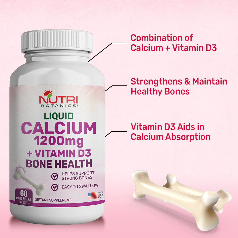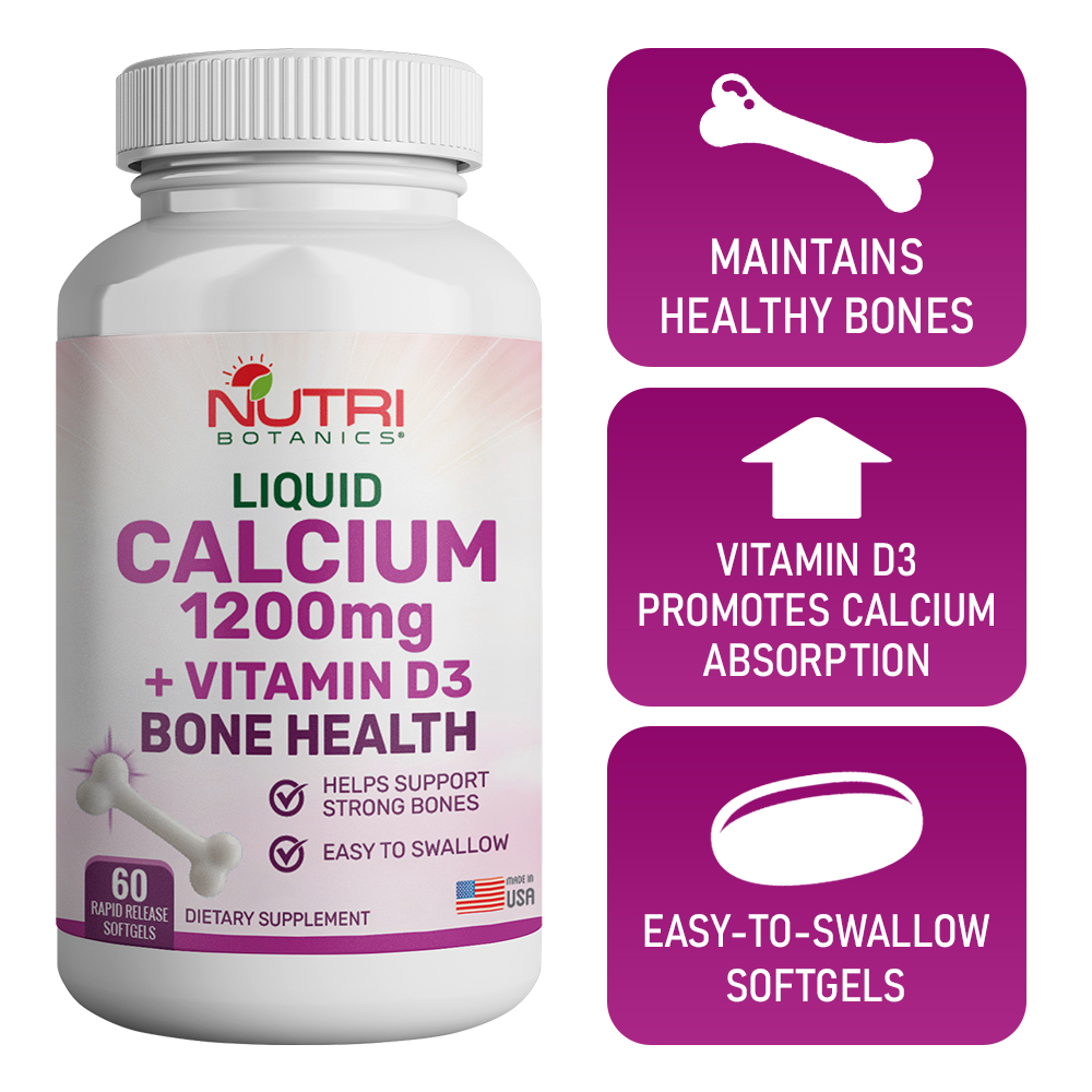 Nutri Botanics Liquid Calcium 1200mg + Vitamin D3 Bone Health Supplement – Rapid Dissolving with Enhanced Absorption – 60 Softgels, Easy to Swallow - Maintain Healthy Bones & Immune System - Soothes Muscle Contractions & Nerve Impulse