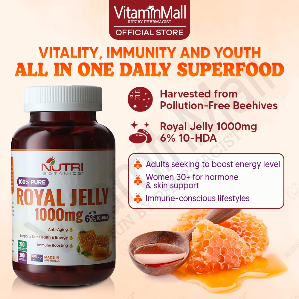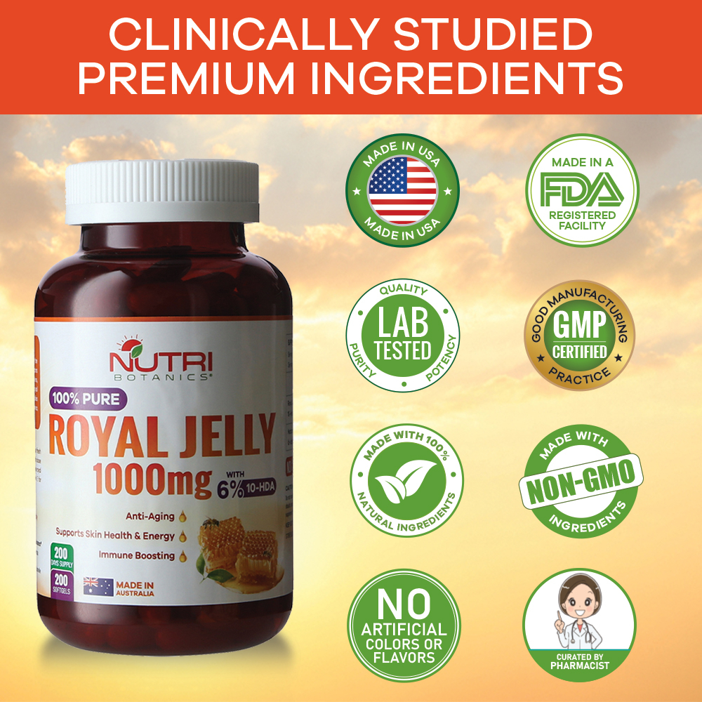Nutri Botanics Royal Jelly 1000mg with 6% 10-HDA – Immune Booster, Enhance Energy, Anti Aging, Younger Looking Skin - Pure Australia Royal Jelly Supplement – 200 Softgels