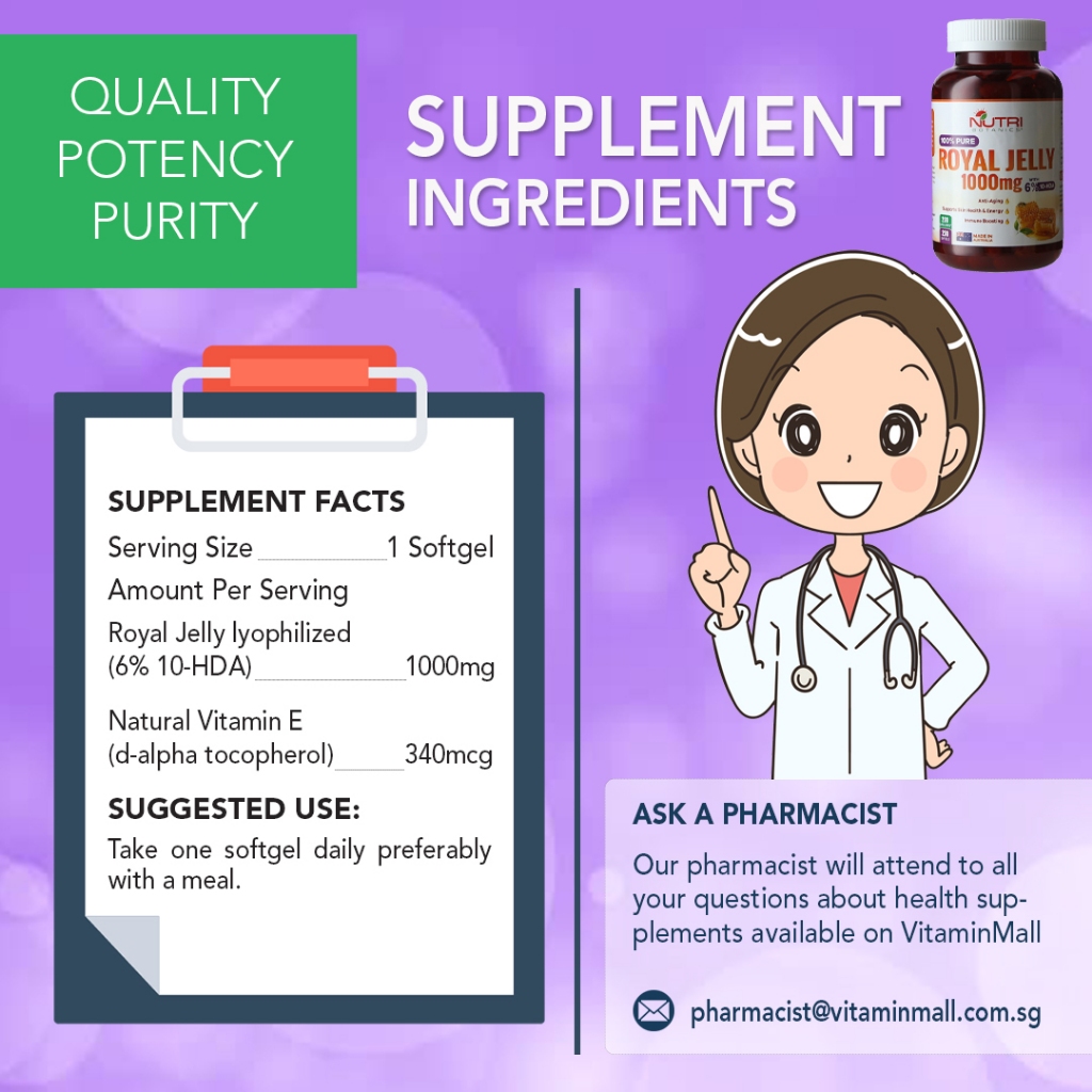 Nutri Botanics Royal Jelly 1000mg is a anti-aging superfood supplement that can help to boost immunity and promote skin health. It is a immune system booster as royal jelly contains multiple vitamins, minerals and amino acids that not only boost immune health but also helps fight fatigue and boost energy.