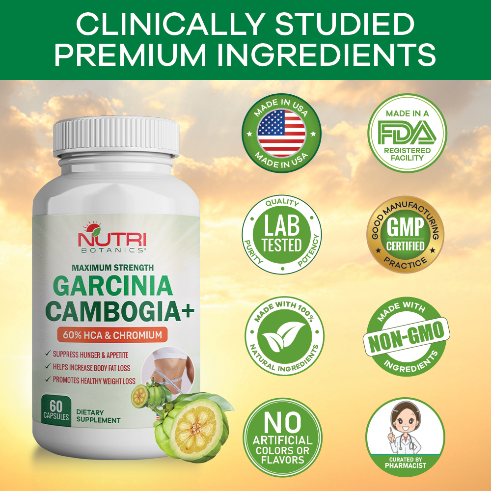 Nutri Botanics Maximum Strength Garcinia Cambogia + is a 100% natural weight loss supplement that will help you to lose weight fast naturally in 3 ways: fast acting fat burn, boost metabolism and curbs appetite. This clinically proven weight loss supplement is formulated with Garcinia Cambogia of the maximum potency and infused with chromium picolinate to support healthy weight management and lean body mass.