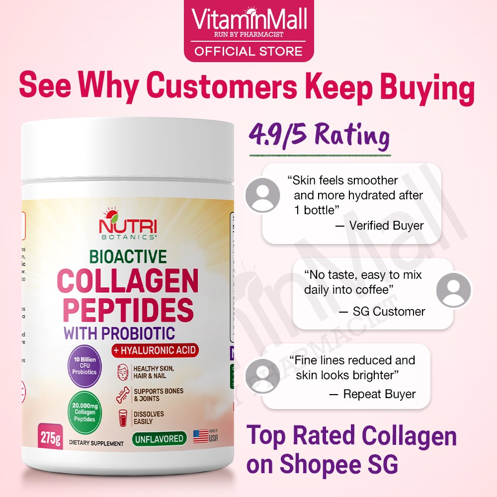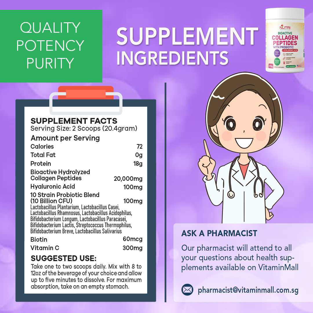 Look years younger and more radiant with Nutri Botanics Collagen Peptides Powder with Probiotics. This collagen supplement is clinically formulated with collagen peptides, 10 strain of probiotics, hyaluronic acid, vitamin c and biotin to help you look and feel the best inside out.
